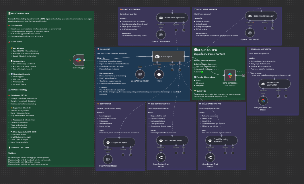 Solution: We built an AI agent that handles market research, content production, scheduling, and performance tracking across all marketing channels.