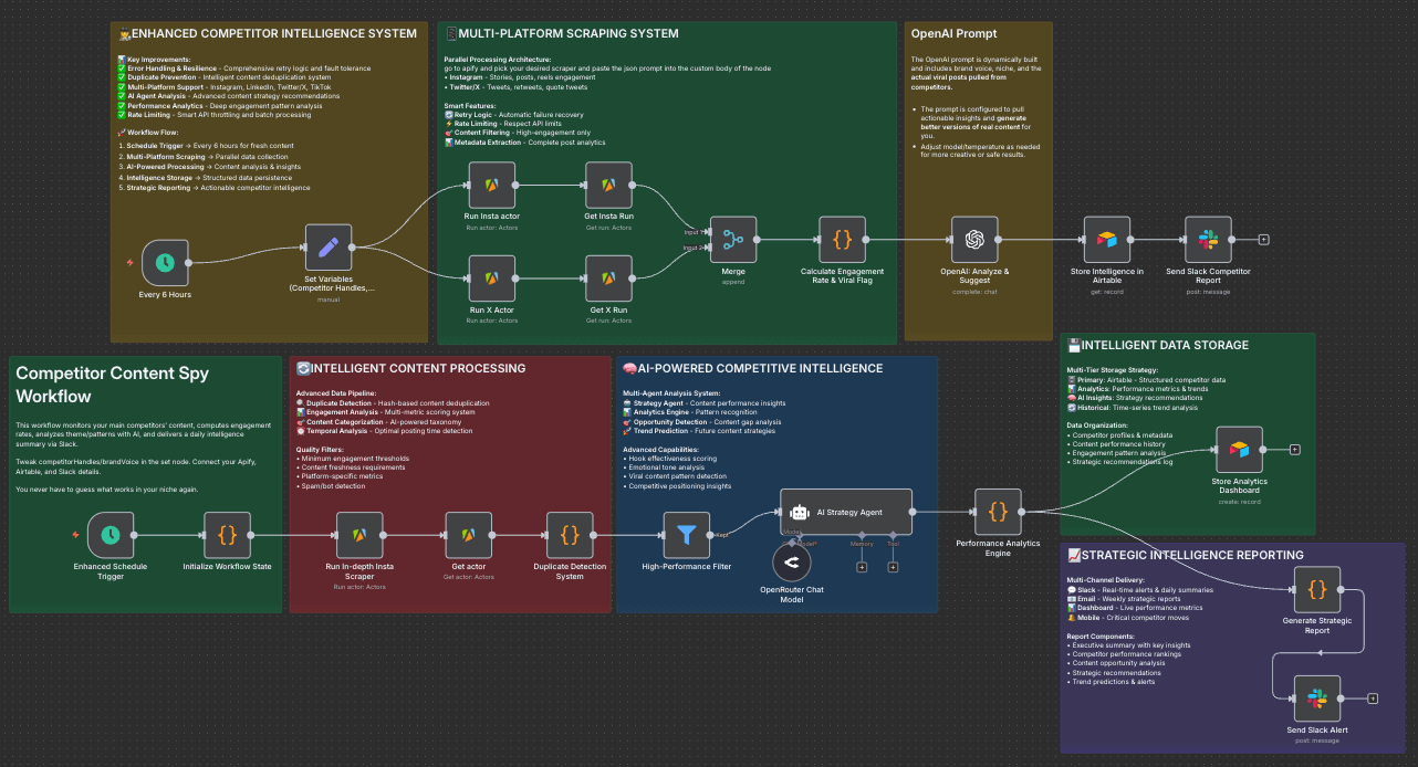 Solution: We created an agent that continuously tracks competitor websites, social media, ads, and content—delivering actionable insights in real-time reports.