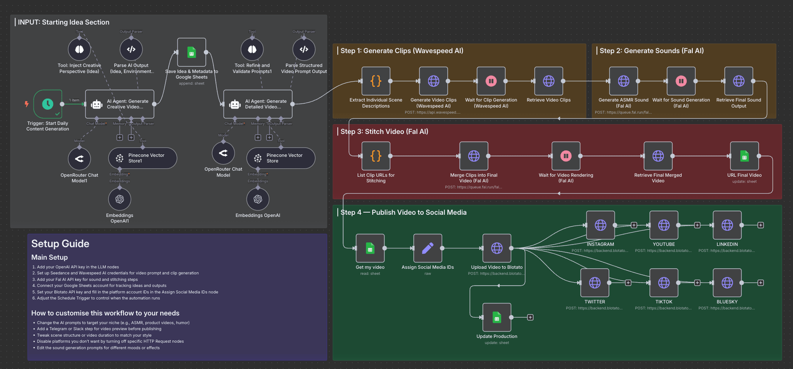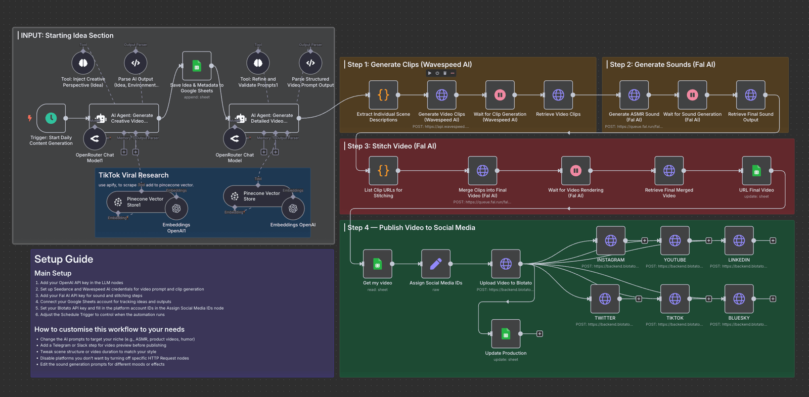 Solution: We built an AI automation agent that generates daily content ideas, produces clips with synced audio, and posts across TikTok and other platforms.