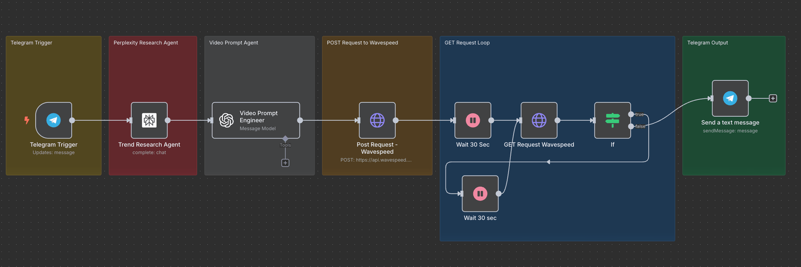 Solution: We developed an AI agent that monitors Telegram trends, transforms insights into prompts, and automatically produces videos through AI.